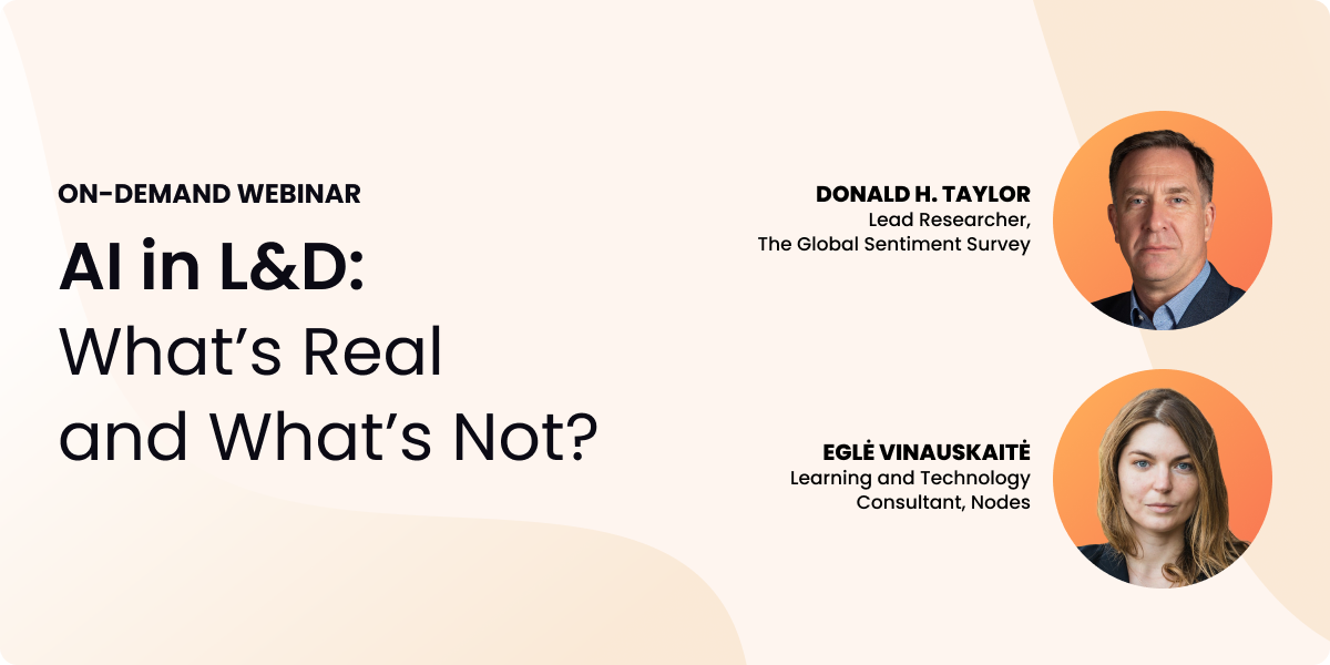 TechnologyJoin us for the webinar in which authors Donald H. Taylor and Eglė Vinauskaitė share the findings of their latest report, AI in L&D: Intention and reality, their third report in 12 months looking into how L&D is putting AI to use. Drawing on a survey of more than 400 practitioners from over 50 countries, plus in-depth case-studies, Eglė and Donald will come to some far-reaching – and sometimes unsettling – conclusions about the progress L&D is making.
